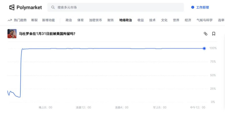 据悉,该平台上的相关市场,在1月3日美国特种部队捕获马杜罗并将其移出委内瑞拉后,迅速从低概率飙升至近100%,导致交易量激增至超过1.2亿美元。