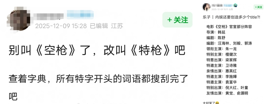 影片官方发布的海报显示,该片领衔主演朱一龙、特别主演檀健次、特意出演梁家辉、特意主演卫诗雅、亲情出演惠英红、特邀主演李施嬅、特邀主演袁富华、特别出演倪大红……几乎每人一头衔,人人不重样。有网友辣评:“别叫《空枪》,改叫《特枪》吧。查着字典,所有特字开头的词语都搜刮完了吧。”